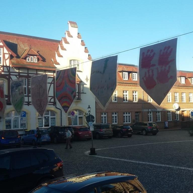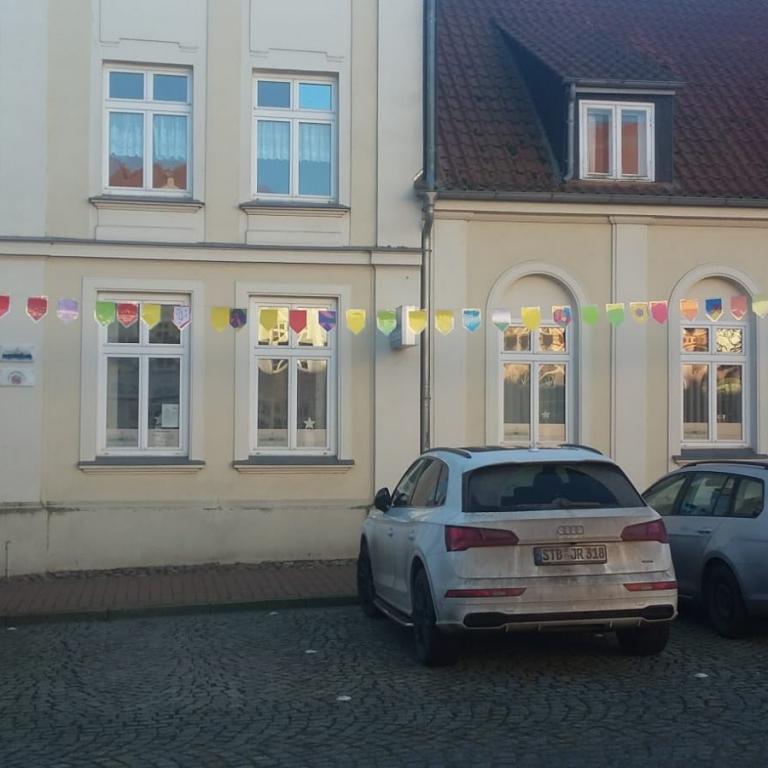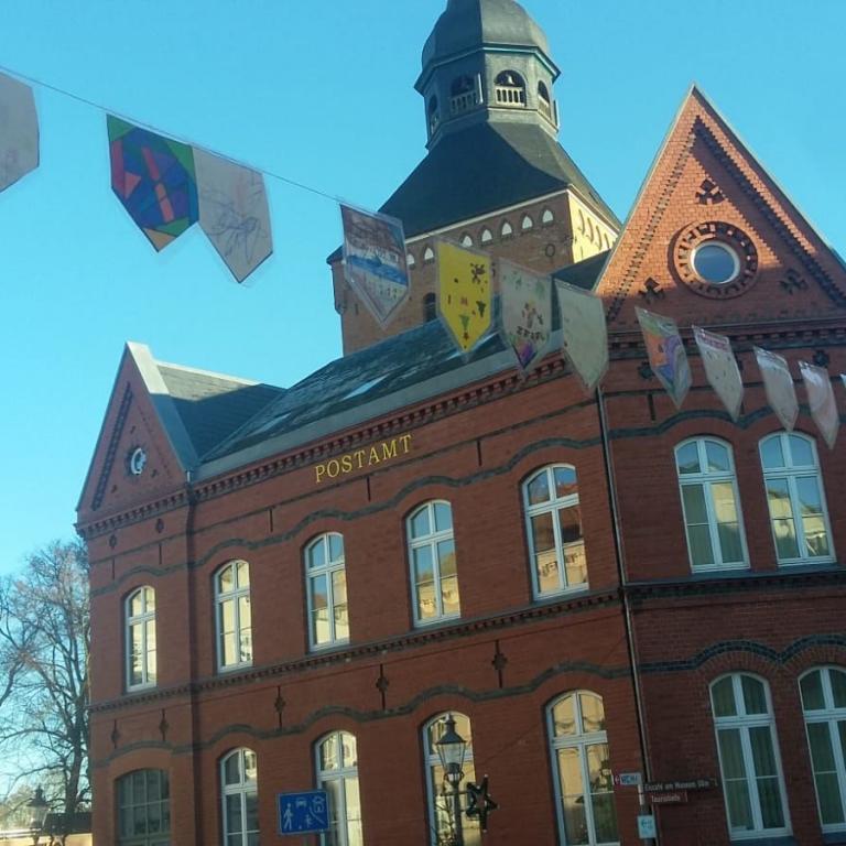Viele Fußgänger, die gestern über den Markt gingen, haben sich gewundert, warum dort auf einmal eine lange Wimpelkette hängt. Bei herrlichem Sonnenschein hat gestern der Bauhof Sternberg unsere lange Wimpelkette für die Aktion "Wir machen Sternberg bunt" aufgehängt - an dieser Stelle noch einmal vielen Dank! Diese wurde von vielen fleißigen Kindern bunt gestaltet und flattert nun bis kurz vor Silvester auf dem Markt. Liebe Kinder, kommt doch mal mit eurer Familie vorbei und sucht euer Bild...